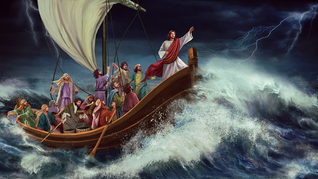 Sent samma dag bestämde han att de skulle fara över till andra stranden. Han gick ombord som han var, och en del andra båtar gjorde dem sällskap. Då blåste det upp till storm, så att vågorna slog in i båten och den var nära att sjunka. Men Jesus, han låg i aktern med huvudet på kudden och sov. – Mästare! ropade de och väckte honom. Bryr du dig inte om att vi går under?! Han vaknade, gav vinden en åthutning och sa till sjön att bli lugn och stilla sig. Och genast tappade vinden andan och sjön lade sig spegelblank.