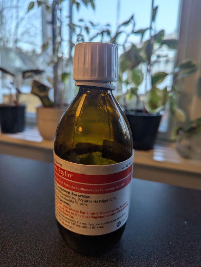 Tänker även på de som utvecklat den hostmedicin jag just nu använder. På sitt sätt är de också ett bönesvar, människor som genom sin kunskap och sitt arbete har bidragit till något som förhoppningsvis hjälper mig att bli av med hostan.