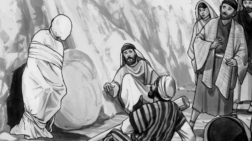 Efter att Jesus bett till sin far ropade han med hög stämma: Lasarus kom ut! Då kom den döde ut, med fötter och händer inlindade i bindlar och med ansiktet täckt av en duk. Människorna som stod utanför graven måste ju häpnat och blivit alldeles förstenade när Lasarus plötsligt kom gåendes ut ur graven. Han måste ju sett ut som en mumie!